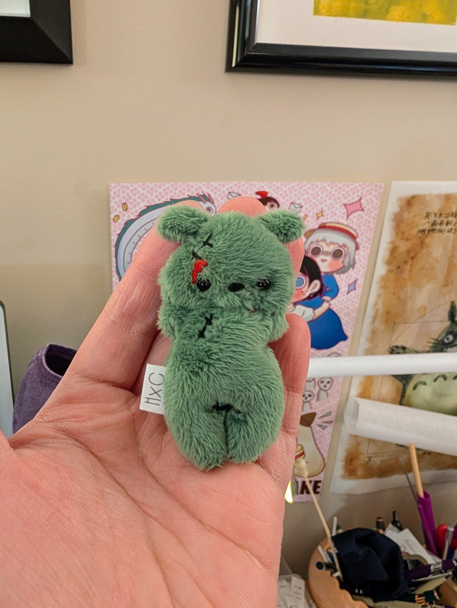 Made with basil green short minky. Used black and red DMC threads for body stitch marks and "blood" dripping marks. Ears are sewn on by hand.