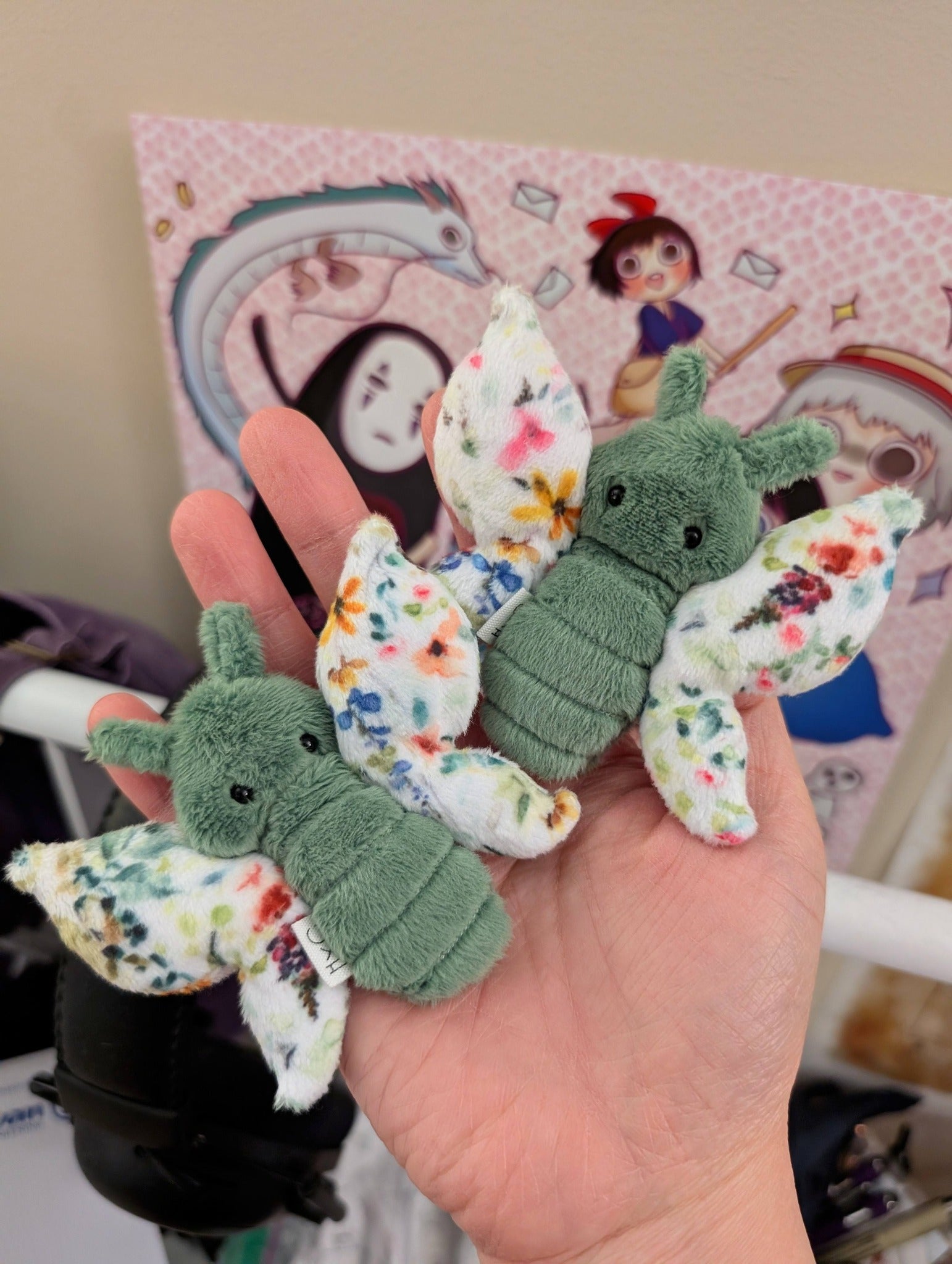 Charm size (3in tall), stuffed with ultra plush polyfil and weighted with glass beads. Wings are made separately and sewn on by hand. Wings are also lightly stuffed with the same polyfil stuffing.