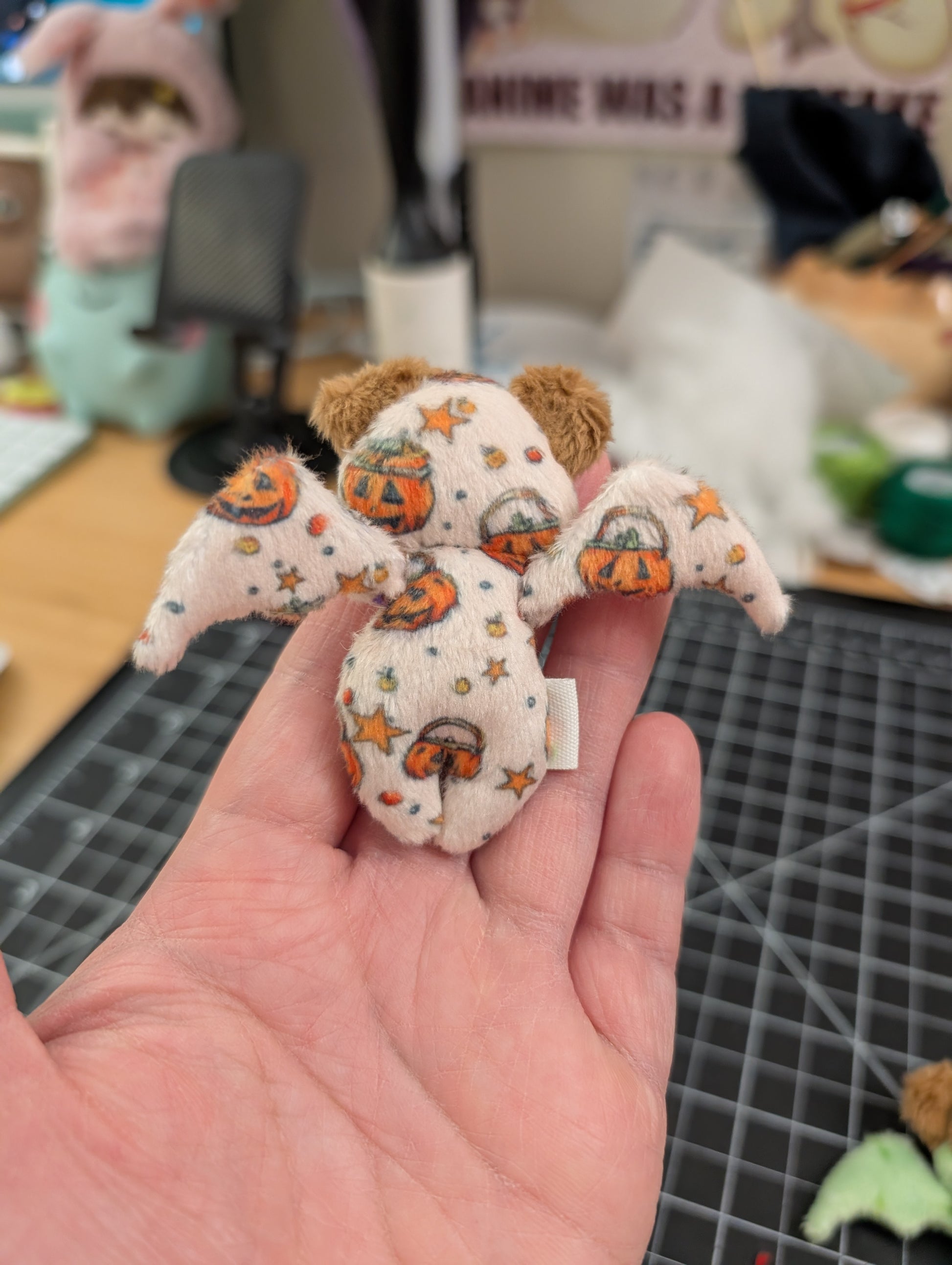 Made with printed minky, brown short minky and black thread for the nose. Wings and ears were handsewn on.