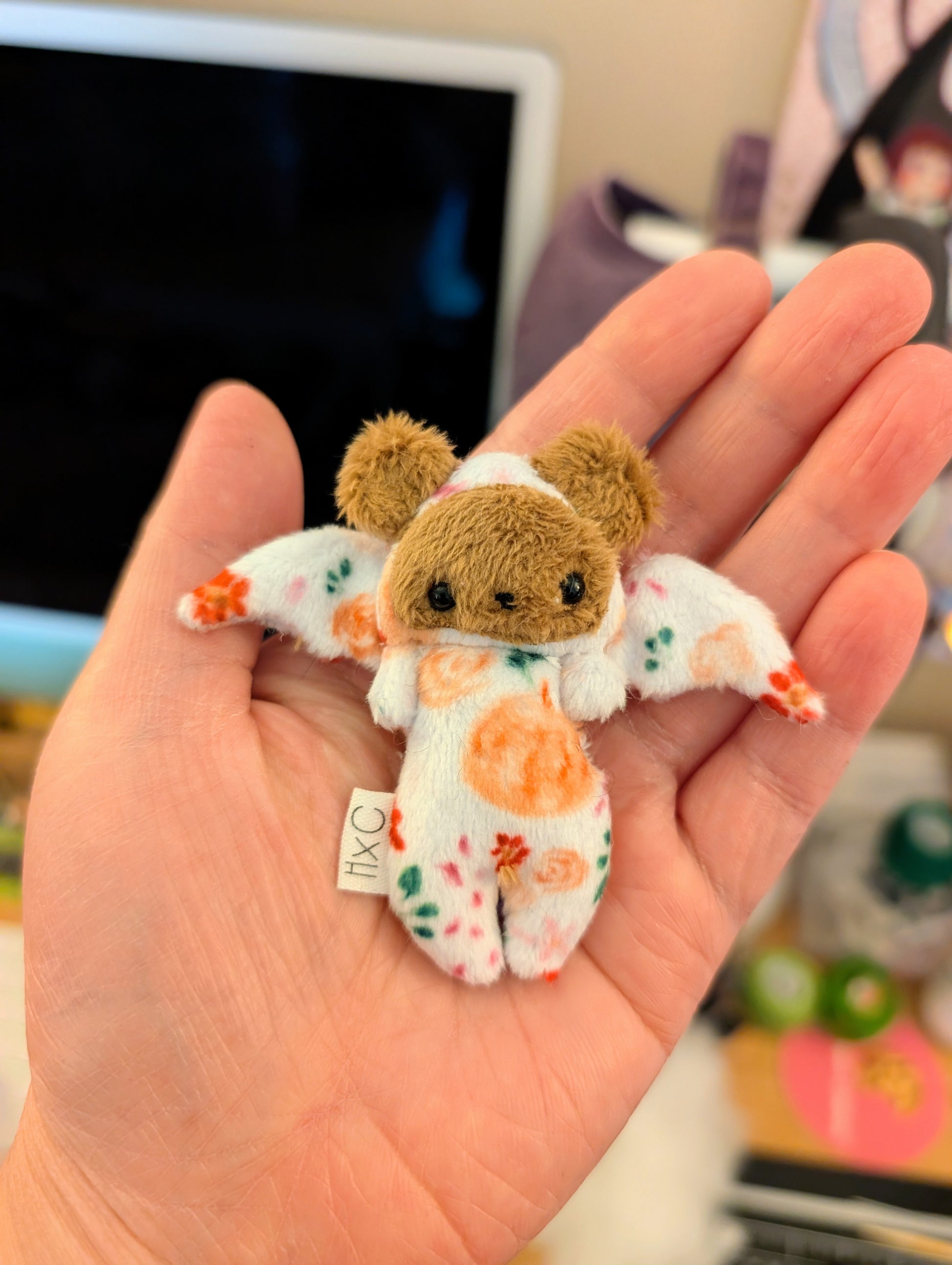 Made with printed minky, brown short minky and black thread for the nose. Wings and ears were handsewn on.